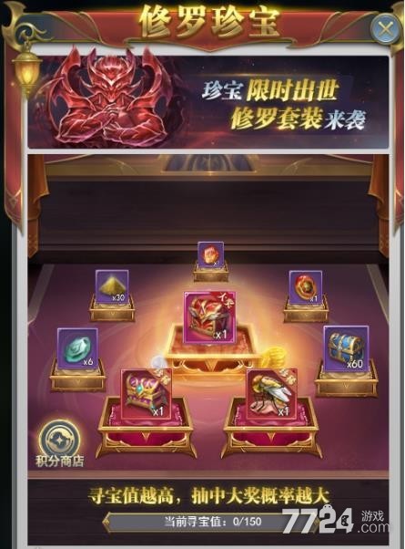 通过修罗珍宝进行抽取,修罗现世珍宝活动专门抽取,寻宝值越高,抽到的概率就越高。大奖就是修罗套装,一次抽奖都是需要2000钻石的,玩家可以进行十连抽,专门的抽取,还可以解锁积分,有着积分的保底机制进行开启。